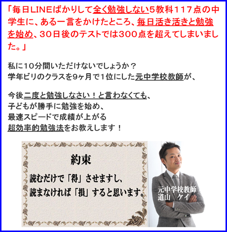 【塾に通わなくても30日間でテストの成績が上がる勉強法】高校受験・高校入試の土台を作る!!元中学校教師道山ケイの定期・中間テスト対策プログラム~ 口コミと体験談